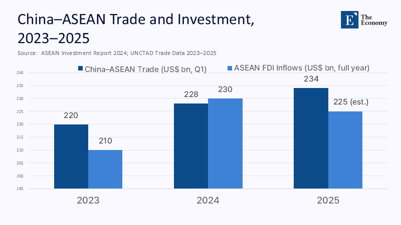 The economic interdependence between China and ASEAN is a compelling argument for a 'friendship-first' approach. ASEAN is China's largest trading partner, as seen in recent years; in Q1 2025, bilateral trade totaled about US$234 billion. China also channels the bulk of its seaborne energy through Malacca, with nearly four-fifths of oil imports historically transiting the South China Sea and the strait. Meanwhile, ASEAN's FDI inflows hit a record US$230 billion in 2023, with green- and digital-economy projects surging—opportunities China wants to anchor in supply-chain partnerships rather than watch move to rivals. Add RCEP's consolidation effects, and you have an economic case for 'friendship first' that is not moralizing; it is portfolio management. A region that owns the doors to your lifelines is a region you over-invest in diplomatically, commercially, and logistically.